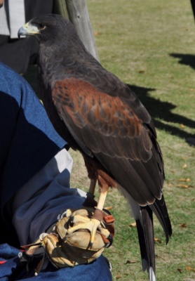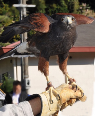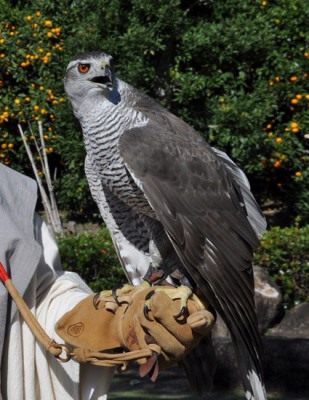 鷹の爪が鋭いので、鷹匠さんはけっこう頑丈な革製の手袋(?)をしていました。