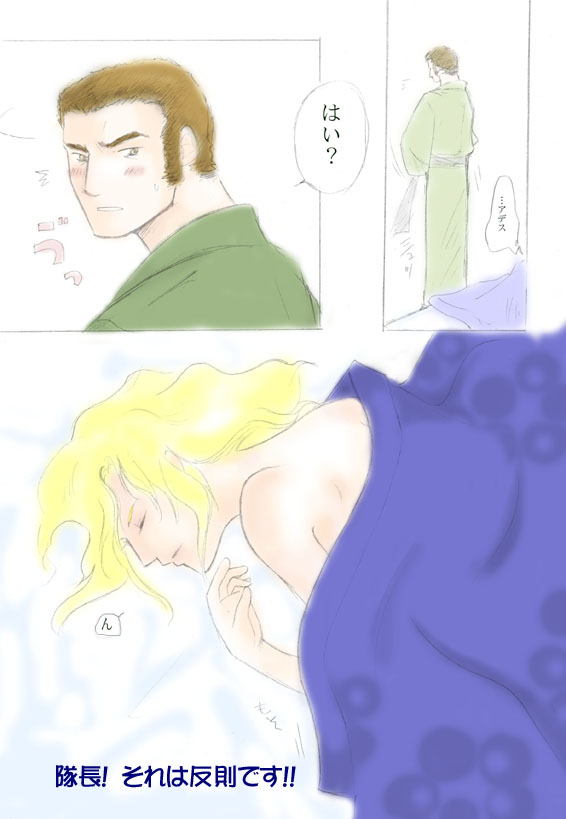 | +虫の音+ 虫の音が聞こえる。 窓の外は秋の風情だ。庭の萩が風に揺れていた。 アデスは、ようやく寝付いた人を起こさないように、静かにベッドから立ち上がった。 慣れた仕草で素早く浴衣を羽織り、帯を締める。 まだ夜は長い。共にいられる時間も………。 だが、朝が来れば二人の関係はただの上官と部下に戻る。 それを知っているから、時を惜しむように抱き合い、疲れて眠りについた。 それでも、数時間で目が覚めてしまうのは、戦艦という特殊な環境下での任務ローテーションに慣れてしまったせいだろうか。 窓からの月明かりのせいか、部屋は薄青く染まり、アデスはベッドの脇に腰掛けて、青い光に照らされた彼の横顔を愛おしそうに眺めた。 先ほどまで熱く火照っていた肌は、窓から流れ込む涼やかな外気にさらされて、冷たさを取り戻している。 まだ夢の中なのだろう。乱れた髪がシーツに散り、肌掛けかわりの浴衣から覗く白い肌が、時折ふるりと震えた。身じろぎに合わせて、金色の髪が肌を滑り、白いシーツの波に落ちる。 群青色の布地に濃紺の染め抜きがされた浴衣は、青白い光の中で更に青さを増して見えた。 彼の素肌を覆う群青と、白い肌、そして緩くうねる金髪との対比が鮮烈な印象を与え、アデスはただ心から美しいと感じた。 眠る人は、伏せられた瞼と冴え冴えとした美貌と相まって、一種の近寄りがたさを醸し出していた。 アデスには、指先や唇に残るぬくもりがなければ、つい先ほどまで、この美しい人が自分の腕の中にいたとは信じられないほどだ。 ふと、その人は肌寒さを感じたのか、隣にいたはずの男のぬくもりを求めるように手を伸ばした。 アデスがベッドを抜け出してからまだそれほど経っていなかったので、ぬくもりが残っていたのだろう。無意識にシーツに指を這わせて、何かを探すような彼の仕草に、アデスは思わず手を伸ばした。 普段は白い手袋に隠された彼の長い指にアデスは自分の指を絡め、手を握る。 冷えてしまった彼の指先を温めるようにやさしく包み込んだ。 彼の唇がかすかに開き、呼吸がほっと和らぐ。 寝息のようなかすかな吐息を感じ、アデスの頬が緩んだ。 長い間じっと見つめていても、彼が目覚める気配はない。 ほんの少し開かれた窓から入る夜風が、だいぶ冷たくなっていていた。 アデスは、窓を閉めるために立ち上がろうとした――― ――が。 握られた手がほどけない。 無理に離せば、起きてしまいそうだった。 彼は寒いのか、猫のように身体を丸めている。 男の手に頬をすり寄せるようにして離れようとしない姿に苦笑したアデスは、仕方なく再びベッドにもぐりこみ、素肌のラウを抱き寄せた。 窓の外から聞こえる虫の音が心に染み渡るように響く。 その声が彼の眠りを妨げるものではないことに安堵した。 額が触れ合うほどに顔を近づけても、目を覚まさない。 そのことをどこか嬉しく感じながらアデスもまた眠りに就いた。 彼の穏やかな寝息が、朝まで続くことを祈りながら……………。 ◇ 一晩中、開けたままになってしまった窓から、まぶしい光が差し込む。 朝、いつものようにラウより先に起きたアデスは、静かにベッドを抜け出した。 乱れた浴衣を手早く直し、朝食の支度をしようとベッドから離れた時だった。 「…アデス………」 自分の名前を呼ばれて、振り返ったアデスが目にしたのは――――― |
